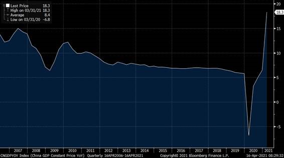 Esta mañana hemos conocido en China el PIB 1T21, con moderación trimestral +0,6% (vs +1,4% esperado y +3,2% en 4T20) pero fuerte incremento interanual +18,3% (vs +18,5% esperado por los analistas y +6,5% anterior) por favorable base de comparación. Los datos de marzo (producción industrial +24% y ventas por menor +34%), muestran cómo el consumo, más rezagado inicialmente frente a las manufacturas, va aumentando su contribución a la recuperación.