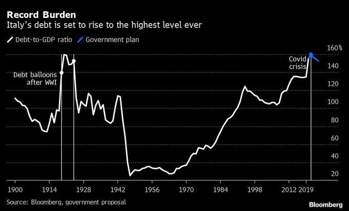 En Europa ayer conocimos el dato de que Italia ha alcanzado un máximo histórico de Deuda sobre PIB del 159,8% por encima del anterior máximo en 1920 (159,5%).