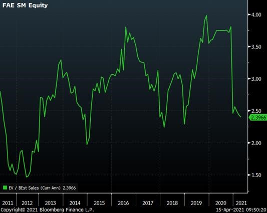 Estamos construyendo una posición en la farmacéutica Faes Farma, compañía fundada en 1933 con una estructura accionarial y de capital excepcionalmente sólidas, sin deuda, con generación de caja recurrente (unos 50 millones de euros anuales), EBITDA de 100 millones al año e ingresos esperados para el 2021 por encima de los 400 millones de euros, capitaliza por encima de los 1000 millones de euros, lo cual puede parecer una valoración exigente (2,5x Ventas, 10x EBITDA) pero está muy por debajo del sector y por debajo de sus medias históricas, y paga un 4% de rentabilidad por dividendo, ROE por encima del sector…