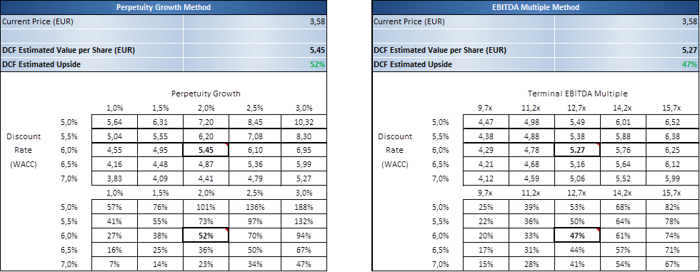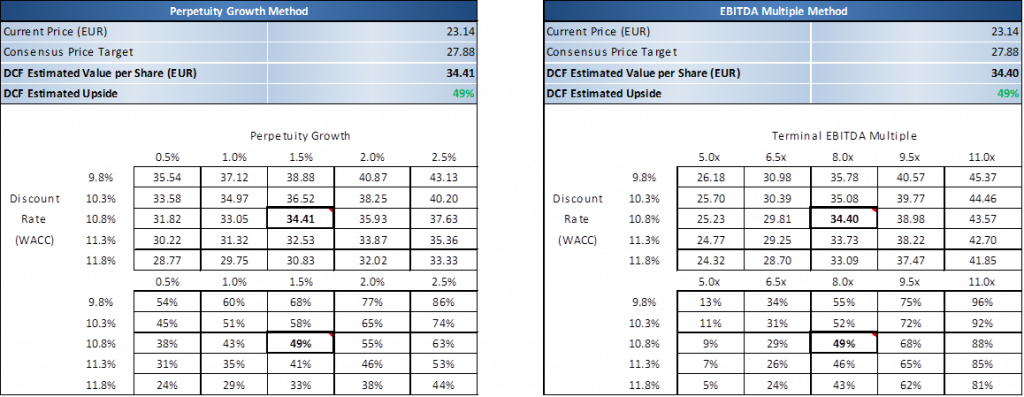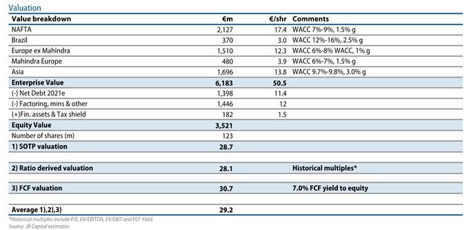 Nosotros para valorar CIE utilizamos un DFC que nos da un precio objetivo de unos 30 euros por acción, para JBCapital, que coge la media de 3 valoraciones (Suma de partes, valoración de múltiplos y DFC) y obtienen un precio objetivo de 29,2 euros por acción.