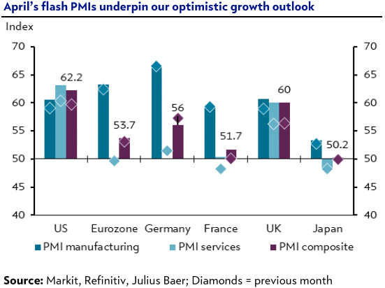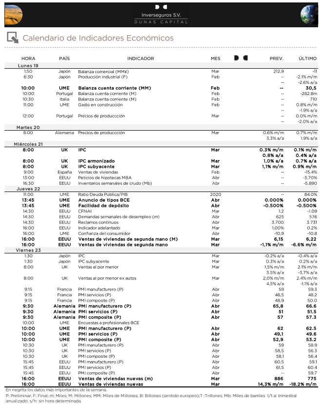 Los PMIs preliminares del mes de abril se espera que sigan mostrando gran solidez en Estados Unidos, mientras que en Europa las restricciones a la movilidad seguirán afectando al sector servicios, pero en menor medida de lo inicialmente estimado.
