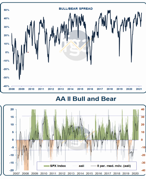 Aunque creemos que la renta variable seguirá siendo el activo en el que hay que estar invertidos en el medio/largo plazo, pero estos niveles de sobrecompra, sobretodo en Estados Unidos, creemos que llevarán a caídas en el corto plazo, por eso seguimos comprando coberturas sobre el S&P 500 y el Nasdaq 100, porque aunque en el medio plazo seguirán dando buenas rentabilidades, se tomarán un descanso en el corto plazo como sucedió en los mercados alcistas de los años 80 y del 2008.