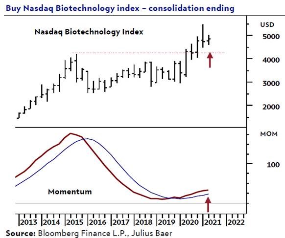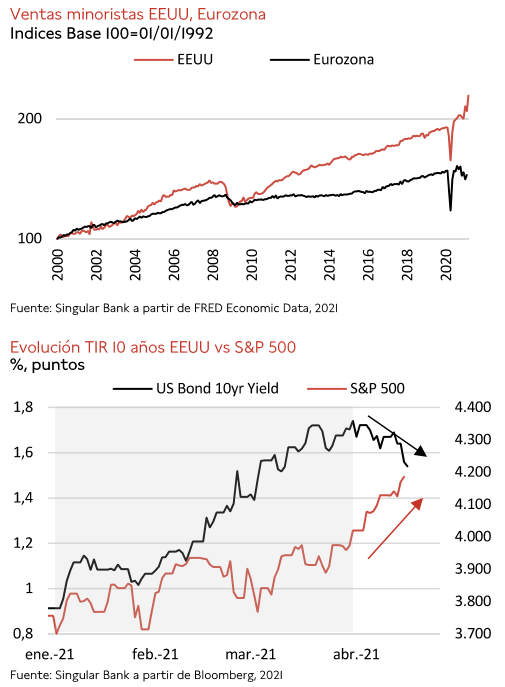También los analistas de Julius Bäer revisaron esta semana sus expectativas de crecimiento del PIB estadounidense para este año al +7% (vs +6.4% anterior) tras la subida de las ventas minoristas (+9.8%), la producción industrial, la capacidad utilizada y las encuestas de sentimiento. El buen ritmo de vacunación permite reabrir una economía cuyos consumidores tiene mayor poder adquisitivo (gracias a las transferencias directas recibidas) y se sienten más seguros financieramente gracias a la mejora del empleo. La Reserva Federal está ignorando la subida temporal de la inflación y sólo se preocupa por alcanzar el pleno empleo.