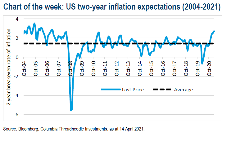 En Estados Unidos el IPC aumentó un 0,6% el mes pasado, lo que llevó la tasa de inflación al 2,6% interanual (tasa subyacente del 1,6% interanual). Los precios de la energía aumentaron más del 9%, las tarifas de los hoteles subieron casi un 4% mientras que los seguros de automóviles aumentaron más del 3%. A medida que la economía se reabre, se espera que la demanda reprimida de servicios y la escasez de oferta se sumen a los efectos básicos para forzar un aumento de la inflación en el corto plazo. Sin embargo, lo que le importa al mercado es cómo se compara esta realidad con las expectativas. Se ha notado varias veces que las expectativas de inflación se han movido en una cantidad muy sustancial en los últimos 12 meses aproximadamente. De hecho, la tasa de equilibrio de dos años ha aumentado de alrededor del -0,5% en abril de 2020 al 2,7%. Ese cambio de 3% en las expectativas es el más grande que podemos encontrar históricamente. Las expectativas de inflación a largo plazo (10 años) han aumentado, pero no tanto (alrededor del 1,75%) y apenas se han movido en las últimas semanas. Las fuerzas seculares de desinflación a largo plazo permanecen en su lugar. Los efectos de la globalización, la tecnología, la demografía y la desunionización no se han revertido y es probable que la inflación se mantenga baja a largo plazo.