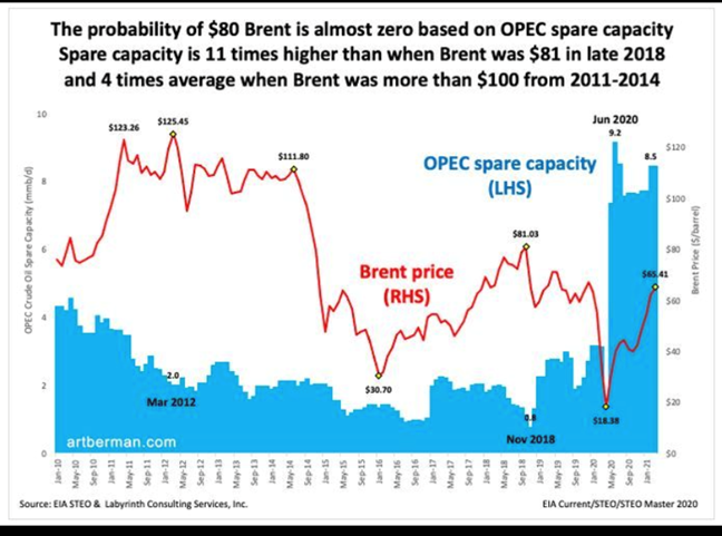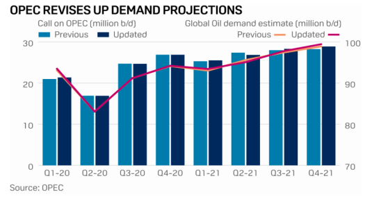 La semana pasada la OPEP elevó sus previsiones para la demanda mundial de petróleo del 2021 en 190.000 barriles por día a un promedio de 96,46 millones por día, lo que implica un crecimiento de aproximadamente seis millones por día desde 2020. Al mismo tiempo, la OPEP redujo las perspectivas para este trimestre en 520.000 barriles por día, esto se vio compensado por un impulso proporcional al cuarto trimestre. Claramente la demanda de petróleo se verá incrementada a medida de la reapertura de las economías.