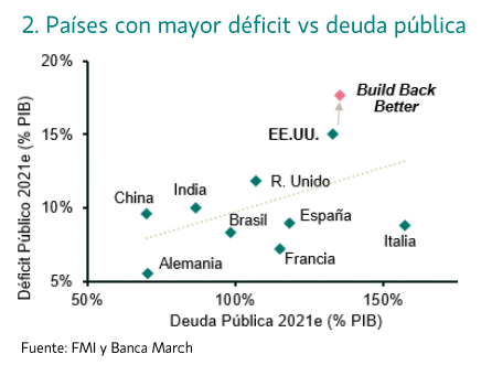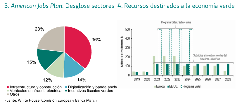 En Estados Unidos el programa de Biden (Build Back Better) compuesto por 3 paquetes (1,9 billones del plan de rescate fiscal lanzado en Marzo, el nuevo plan de infraestructuras y el American Family Plan) son un nuevo cañonazo de estímulos para la economía norteamericana que, desde la llegada de la crisis del Covd-19, ya suma estímulos gubernamentales por encima del 25% de su PIB.