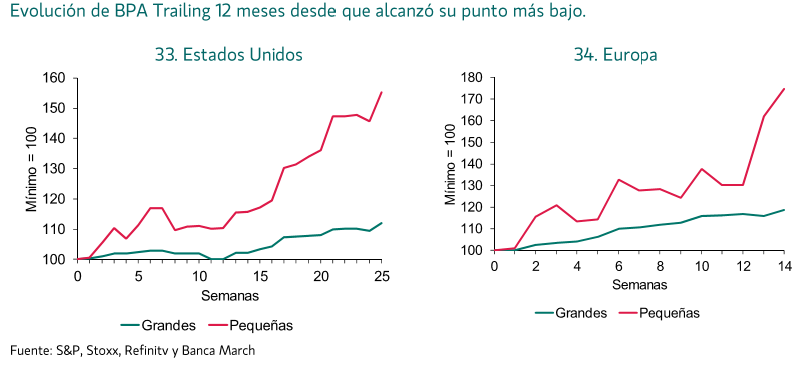 Las pequeñas y medianas compañías lo están haciendo mejor en Bolsa beneficiándose más de la recuperación cíclica que las grandes. Este comportamiento seguirá dándose, en mi opinión, a medida que la economía se vaya normalizando y con la llegada de las reaperturas, ya que las compañías medianas y pequeñas son las que más han sufrido en la crisis. La recuperación de estas compañías se encuentra en una fase incipiente y todavía queda margen de mejora. En Europa los beneficios están aún un 46% por debajo que antes de la pandemia, mientras que en Estados Unidos sólo les queda un 20% por recuperar.