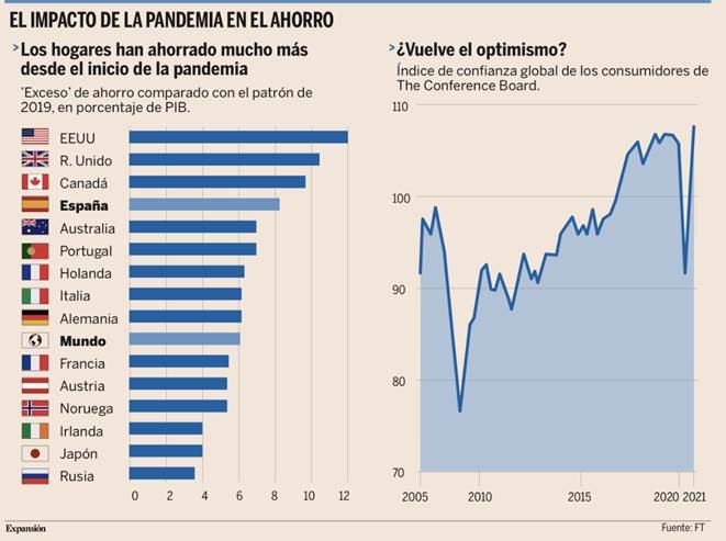 A pesar de que la economía mundial registró la mayor caída de la producción de su historia moderna el año pasado, los ingresos de los hogares se han visto protegidos en gran medida por los programas públicos de estímulo sin precedentes aplicados en la mayoría de las economías desarrolladas. Los consumidores también redujeron el gasto por la alta incertidumbre sobre el empleo y los ingresos, y porque se cerraron o se aplicaron restricciones a muchas empresas de servicios. Debido a ello, la tasa de ahorro de los hogares en muchas economías desarrolladas alcanzó su nivel más alto de este siglo en 2020, según datos de la OCDE, y los depósitos bancarios aumentaron rápidamente en muchos países. Zandi explica que el exceso de ahorro fue mayor en las economías desarrolladas, sobre todo en Norteamérica y Europa, donde se han aplicado confinamientos generalizados y el gasto gubernamental ha sido elevado.