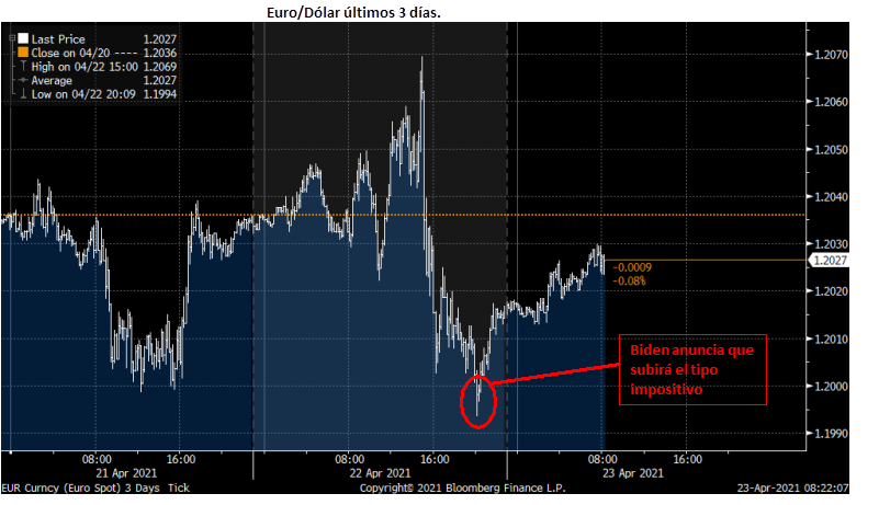 Ayer Biden anunció en la cumbre del clima que Estados Unidos recortará a la mitad las emisiones de efecto invernadero para 2030 y por otro lado el gobierno planea casi duplicar el impuesto a las ganancias llevándolo hasta el 39,6% frente al 20% actual para financiar el gasto social, lo que hizo que las Bolsas cayesen un 1% y llevó al dólar a cotizar por debajo del 1,20 frente al euro