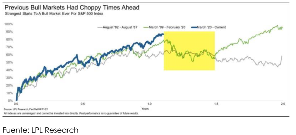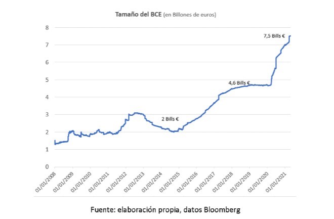 El crecimiento de beneficios es importante para el comportamiento de las bolsas, pero también lo es la provisión de liquidez por parte de los bancos centrales. Visto el escaso efecto que está teniendo en el mercado la brutal nueva ola en la India, la cantidad de liquidez parece ser suficiente para que los inversores puedan centrarse en el que pasará después. Oficialmente la Reserva Federal ni siquiera está pensando sobre la reducción de sus compras de bonos. Cuanto más fuerte esté la economía y mayores sean las expectativas de inflación, más discutirá el mercado la posibilidad de retirada de los estímulos.