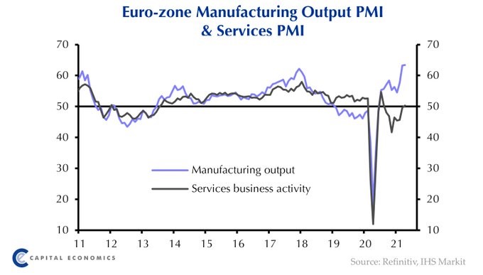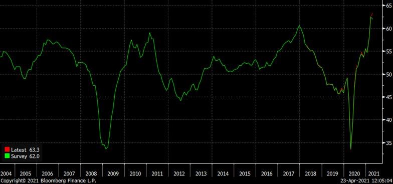 Hoy se han publicado los PMI preliminares manufacturero, de servicios y compuesto del mes de abril en la Eurozona bastante positivos en todos los segmentos (manufacturero 63,3 Vs 62,2 esperado vs 62,5 anterior, servicios 50,3 vs 49,9 esperado por los analistas y vs 49,6 anterior y compuesto 53,7 vs 52,9 esperado vs 53,2 anterior), Alemania (manufacturero 66,4 vs 60,4 esperado vs 66,6 anterior, servicios 50,1 vs 46,7e vs 51,5 anterior y compuesto 56,00 vs 51,9e vs 57,3 anterior). En Alemania e Italia también han sorprendido positivamente los PIMs del mes de Abril. En cuanto al PMI de la eurozona se trata de un dato mejor de lo esperado por el consenso, donde el sector servicios empieza a mostrar signos de estabilización, después del deterioro registrado en meses anteriores. Por su parte las manufacturas siguen mostrando una importante fortaleza, situándose en máximos históricos de las dos últimas décadas.
