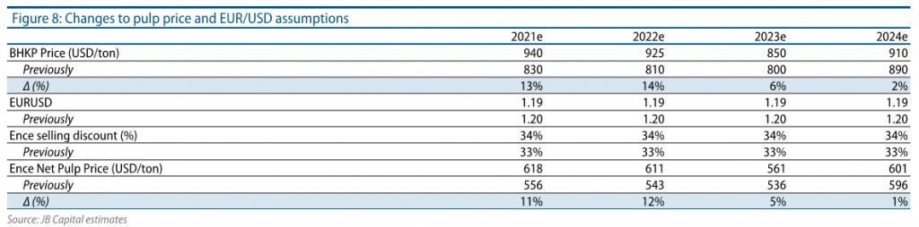 JBCapital aumenta sus estimaciones de precio de celulosa en el periodo 2021-2023 debido a que su reciente recuperación ha sido más fuerte de lo que esperaban ellos y el resto de analistas del sector. Esto, resultó en un aumento promedio de un 26% en sus estimaciones de EBITDA anual de Ence durante esos años (2021-2023).