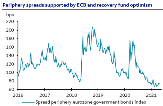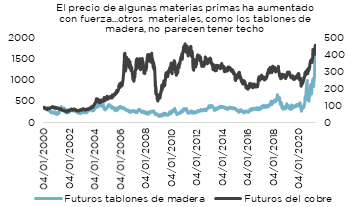 En dicho informe se menciona que la dinámica de inflación sigue muy de cerca a la del PIB debido a las bajísimas bases de comparación y a los cuellos de botella creados por el bloqueo de las cadenas de producción globales (y que no se desharán completamente hasta 2022). Todos los Bancos Centrales son conscientes de las naturaleza transitoria de estos efectos y se han comprometido a mirar más allá y no subir tipos. Será necesario que veamos presiones inflacionistas persistentes más allá de la mitad de 2022 para que los Bancos Centrales cambien el paso.