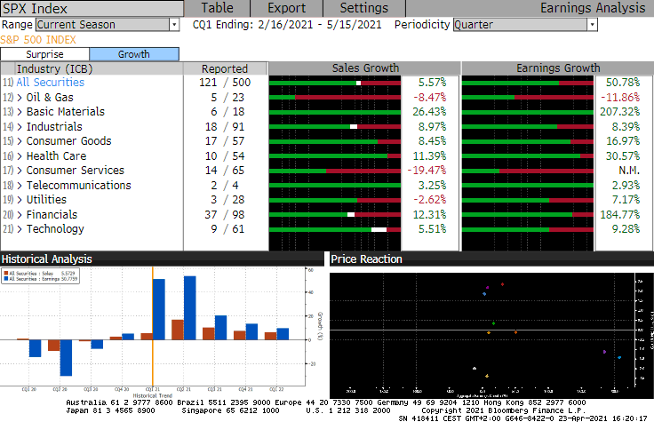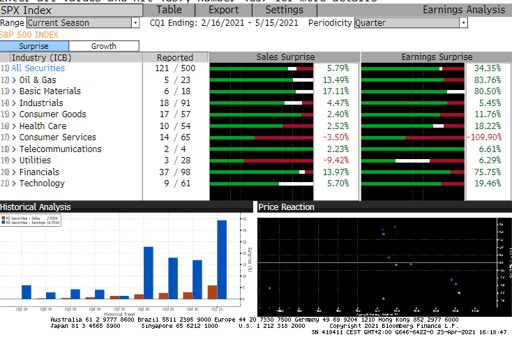 La semana pasada empezó la temporada de resultados del 1T21 en Estados Unidos, han presentado 42 compañías (un 8.5% del índice) y, de momento, los resultados son excelentes: