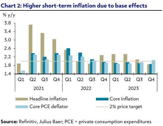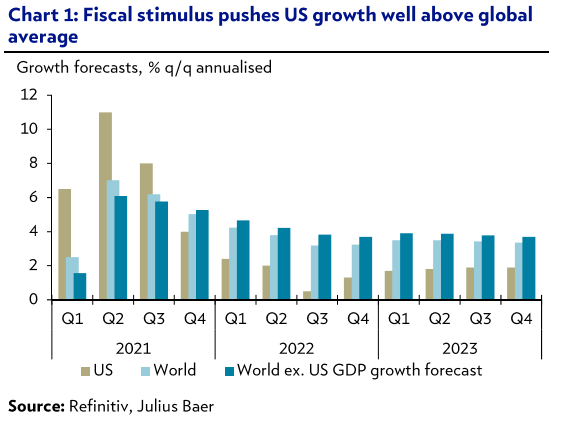 Esta semana Julius Bäer publicó su visión de mercado para lo que queda del 2021, en el mismo analizan el crecimiento de PIB global y destacan como las diferencias regionales seguirán siendo importantes, con Estados Unidos experimentando un crecimiento acelerado, gracias a un boom de consumo provocado por unos estímulos fiscales masivos (e inmediatos), mientras que en China y Europa el crecimiento viene dirigido por la producción industrial y la inversión y será más estable y paulatino. Los mercados emergentes se quedarán por detrás inevitablemente dados sus mayores problemas para controlar la pandemia, el menor espacio fiscal que les da la necesidad de financiarse en moneda extranjera.