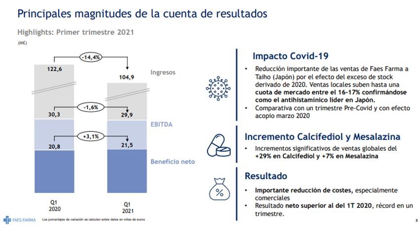 Entre enero y marzo, los ingresos Faes Farma bajaron un 14,4%, hasta los 104,9 millones de euros, por el efecto «acopio» producido el año pasado a causa del Covid, como ya comentamos la semana