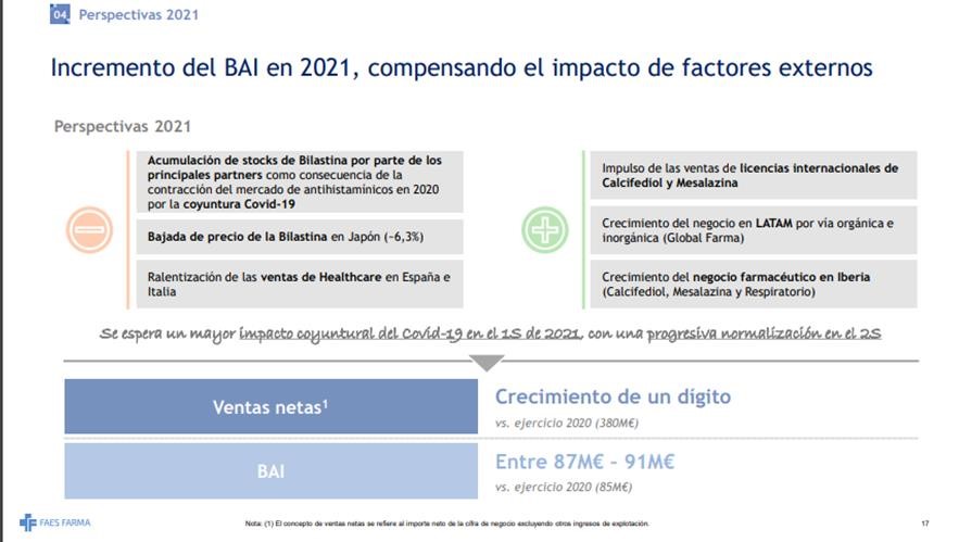 Faes publica resultados del 1T21 el próximo 30 de Abril, un aspecto que habrá que tener en cuenta sobre la evolución de los resultados de Faes Farma en este 1T21 es que compara con un 1T20 que incluía varios factores extraordinarios: la acumulación productos farmacéuticos por parte de farmacias y mayoristas al inicio de la pandemia, principalmente en el mes de marzo 2020, y que impulsaron las ventas del periodo, pedidos del principio activo de Bilastina por parte de socios licenciatarios, especialmente Tahio en Japón, en previsión de un 2020 de fuerte crecimiento de ventas y que la irrupción de la pandemia truncaría más adelante, un ingreso no recurrente vinculado a la consecución de un hito al alcanzar un determinado volumen de ventas de Bilastina en Japón cercano a 4 millones de euros.