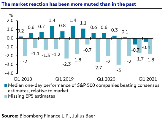La temporada de Resultados del 1T21 están siendo sobresaliente en Estados Unidos y en Europa. El crecimiento de beneficios se sitúa por encima del 40% a ambos lados del Atlántico, demostrando una vez más que los participantes del mercado subestiman siempre la fortaleza con que la economía se recupera de las recesiones. El S&P 500 ha subido un +90% desde el mínimo de marzo mientras los inversores seguían insistiendo en que las compañías estaban sobrevaloradas. Parece que, más bien, las estimaciones de beneficios para 2021 eran demasiado bajas.