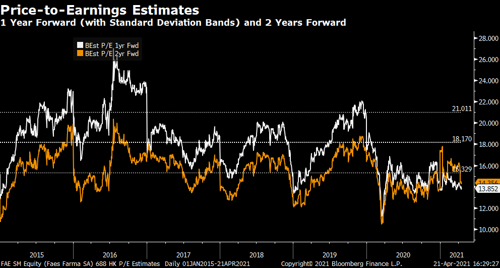Finalmente terminamos de construir una posición en Faes Farma por un 2% de la SICAV a un precio medio de 3,55€, Faes cotiza a mínimos en términos de múltiplos sobre beneficios, cotizando por debajo de su desviación estándar cotizando a un PER esperado a 1 año por debajo de 14 veces.