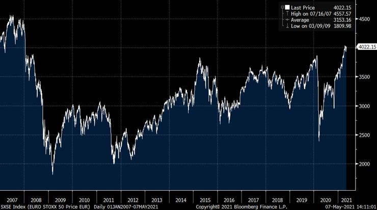 El índice europeo EURO STOXX 50 ha situarse hoy por encima de los 4000 puntos, nivel que no veíamos desde el 2007, cerca de los máximos del año que hizo el 16 de Abril (4032,99)