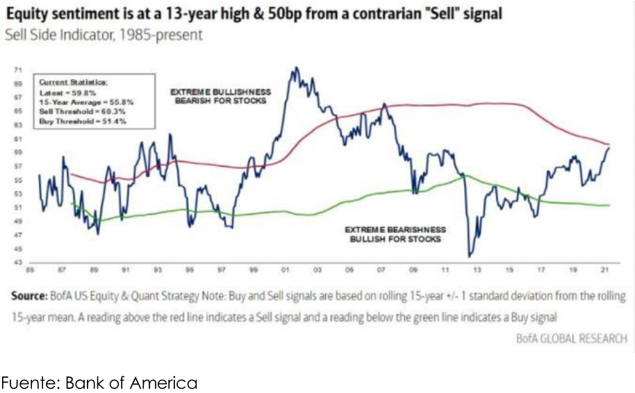 El sentimiento optimista de los mercados de Renta Variable está en máximos de los últimos 13 años y en niveles anteriores a la Gran Crisis Financiera de 2008, lo cual suele ser una señal de venta.