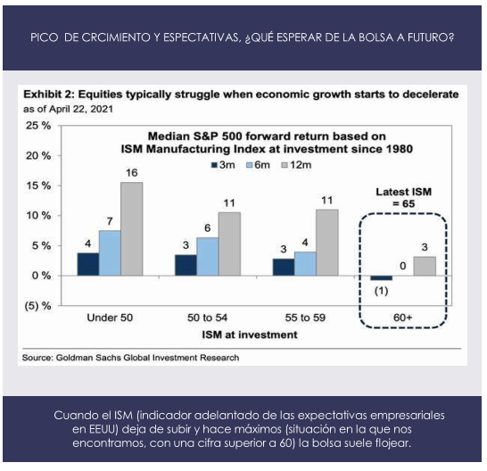 Semana positiva en las Bolsas con subidas semanales de casi un 1% de todos los índices, sobre todo en Estados Unidos donde los índices están en máximos históricos, los resultados empresariales están siendo excepcionalmente buenos, el crecimiento de beneficios es el mayor de la última década y sigue sorprendiendo positivamente, pese a que los analistas han estado revisando sus estimaciones al alza de manera más brusca que nunca. El crecimiento de beneficios del primer trimestre va ser superior al 30% y se espera que en el segundo trimestre el crecimiento supere el 50%. A partir de ese momento el crecimiento de beneficios empezará a perder fuerza, a la vez que perderán “momentum” las encuestas de sentimiento empresarial, aliándose ambos efectos para provocar una corrección en el tercer trimestre del año.