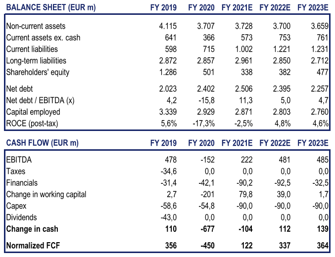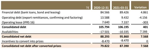 La deuda financiera neta sube hasta los 95,9 millones de euros vs. 88,3 millones en 2020, por incremento de necesidades de circulante. Este año la compañía tendrá que volver a negociar con los acreedores el incumplimiento de sus covenants de deuda, el año pasado ya alcanzaron un acuerdo para obtener una excepción, y este año en principio no debería haber tampoco problemas, después de que el año pasado sólo un bonista puso la negociación un poco más complicada.
