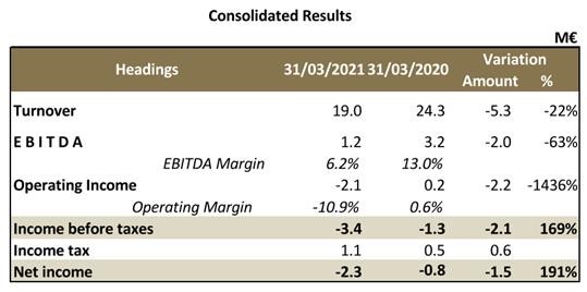 El resultado bruto de explotación (EBITDA) del grupo ascendió a 29,8 millones de euros, un 1,6% menos que en el primer trimestre de 2020, mientras que el resultado neto de explotación (EBIT) se situó en 25,9 millones de euros, un 0,2% más que en los tres primeros meses del año pasado.