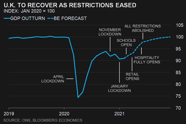 El próximo 12 de Mayo se publica el dato de PIB de Marzo de Reino Unido, los analistas esperan una subida del 5% que hará que el PIB recupere el nivel previo a la pandemia para finales a año, según las previsiones de Bloomberg.