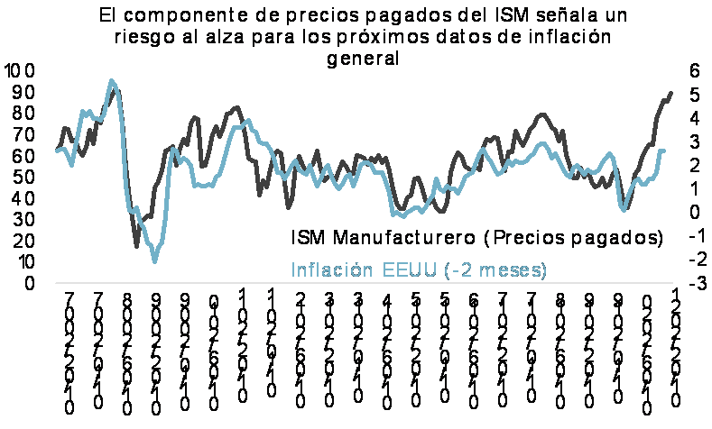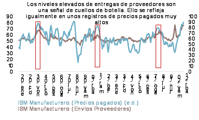 En Estados Unidos destacó la publicación del ISM manufacturero del mes de abril, donde lo más importante no fue tanto en la leve corrección a la baja experimentada por el índice, como las señales de cuellos de botella en los canales de suministro que se siguen apreciando y que se resumen en las siguientes pautas de comportamiento: