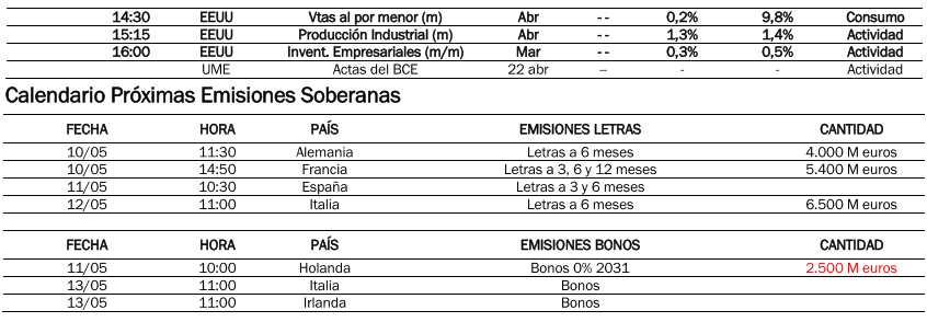 También en Europa se publicaron datos de precios, que permitieron constatar un sensible aumento de la inflación. En particular, los precios de importación en Alemania registraron un alza del 6,9% en tasa interanual, mientras que la inflación en España alcanzó el 2,2% en abril frente al 1,3% del mes anterior.