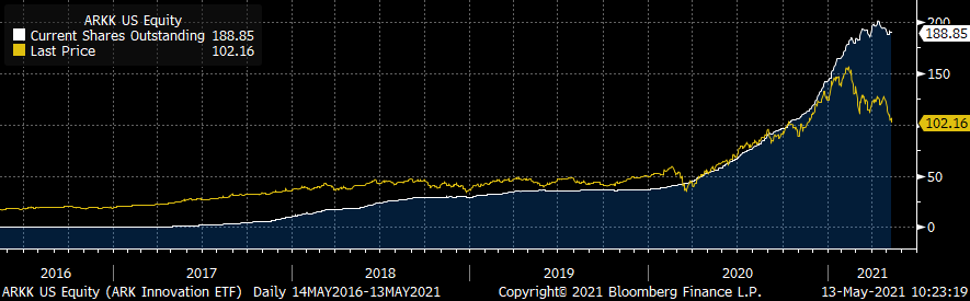 No ha habido «outflows» en ETFs de Equity pese a la corrección de estos días por el miedo generado por la inflación, como ejemplo se puede ver cómo no ha habido ventas relevantes en la ETF ARK Innovation, como paradigma de un fondo de beta elevada.
