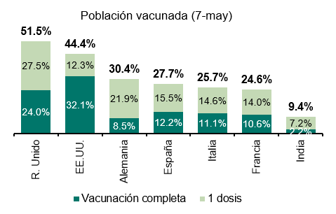 Pandemia en la India. Los epidemiólogos que asesoran al gobierno prevén un pico en el número de nuevos casos diarios esta semana, mientras que la abundante liquidez parece mantener controlado el impacto en el mercado (-7% del índice Sensex, que siguen en positivo en el año). La frialdad del mercado se debe a que, de momento, el impacto en la economía parece limitado por la ausencia de un cierre a nivel nacional.