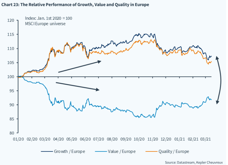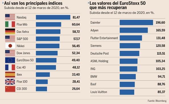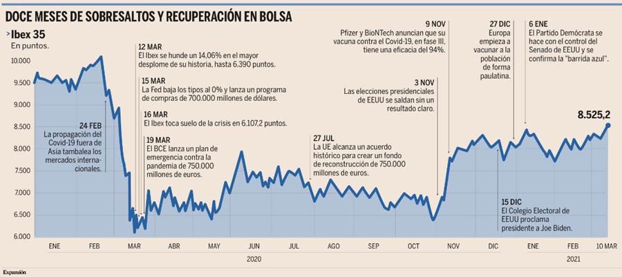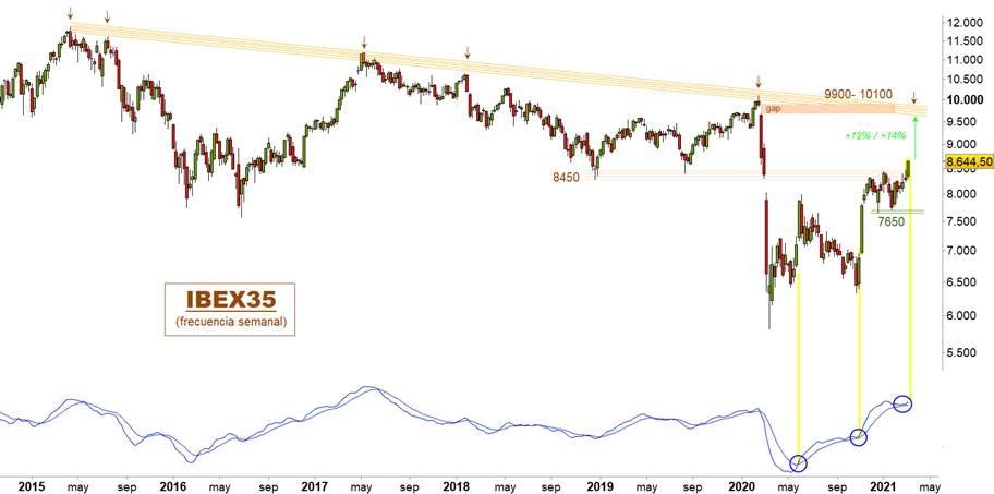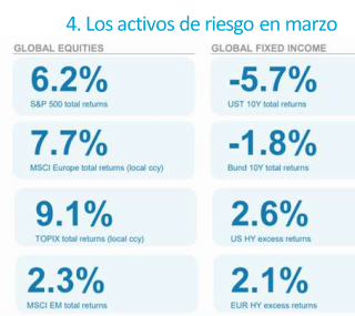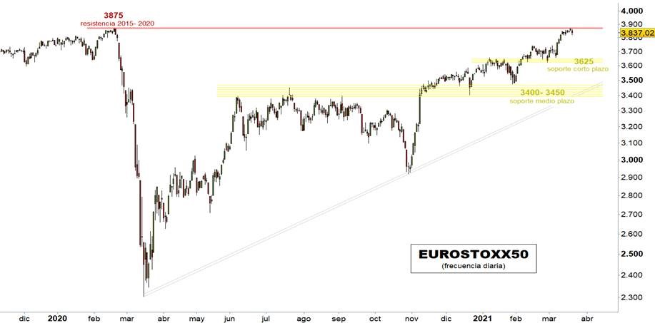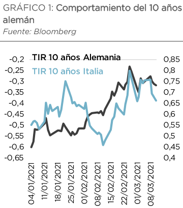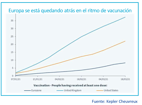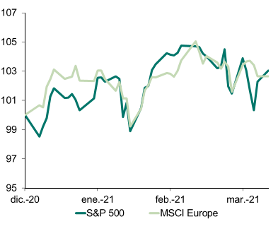 El primer trimestre de 2021 cerró con la mayoría de índices bursátiles registrando nuevos máximos, lo cual no desanimaba para comenzar abril también en positivo. En Europa, el índice que mejor comportamiento ha tenido en el trimestre ha sido el MIB italiano (+11%), tras el golpe de efecto por la presidencia de M. Draghi, seguido muy de cerca por el Dax alemán (+10%), gracias a la euforia que han experimentado las automovilísticas y los grandes valores industriales, con subidas superiores al 20% en el trimestre, y sobre todo Volkswagen (+58%). En España el Ibex era el índice que peor comportamiento relativo tenía a cierre de trimestre (+6,2%), tras el FTSE100 de Londres (+4,3%).
