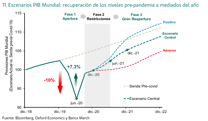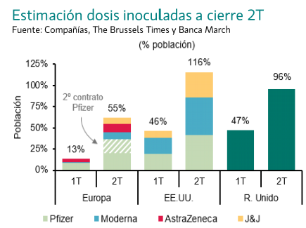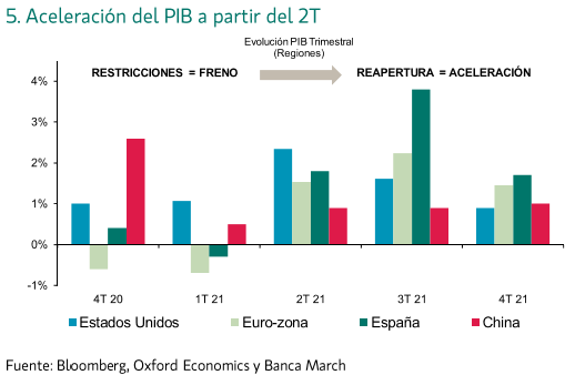 Estados Unidos va camino de crecer un 9.5% en el 2Q21 y un 8.3% en el 3Q21. Después, el crecimiento debería de comenzar a gotear a la baja para acabar creciendo un 6.3% en el año, según los analistas de JPMorgan. Esto tiene un impacto positivo sobre el resto del mundo a través de una mejora en las importaciones y un rally en los mercados financieros. Todo, en un momento en el que las rentabilidades de los fondos soberanos van alza y hay cierta presión alcista sobre el dólar. Así mismo, los analistas de JPMorgan esperan que durante los próximos 3-6 meses se produzca un aumento en la oferta de vacunas que mejore las perspectivas de crecimiento globales.