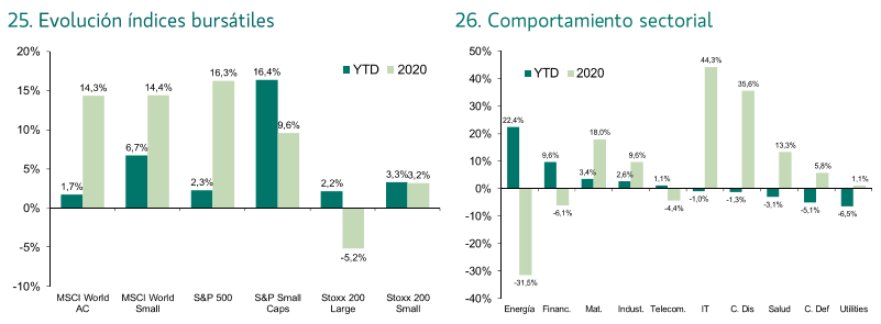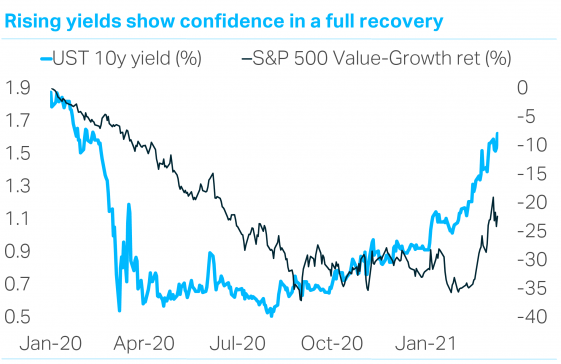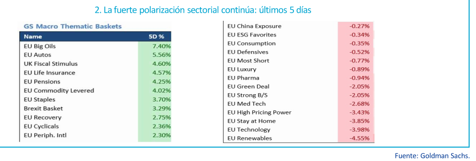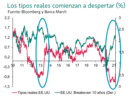 Los analistas todos están de acuerdo en que la recuperación va a distintos ritmos, China el año pasado, Estados Unidos ahora, Europa más tarde este año… Esta recuperación por fases permite que no se generen burbujas en los activos. El entorno para los activos de riesgo es especialmente favorable gracias a las políticas fiscales y monetarias y a las vacunas. Una recuperación sincronizado podría haber llevado a un overshooting en las yields americanas, lo cual no habría sido positivo para los activos de riesgos. El posicionamiento está por debajo de las medias históricas y nuestros estrategas esperan una caída de la volatilidad, por lo que deberíamos de ver flujos de entrada por parte de los inversores sistemáticos, no solo en equity sino en activos de riesgo en general. Cíclicas y energía son nuestras apuestas.