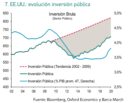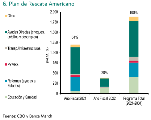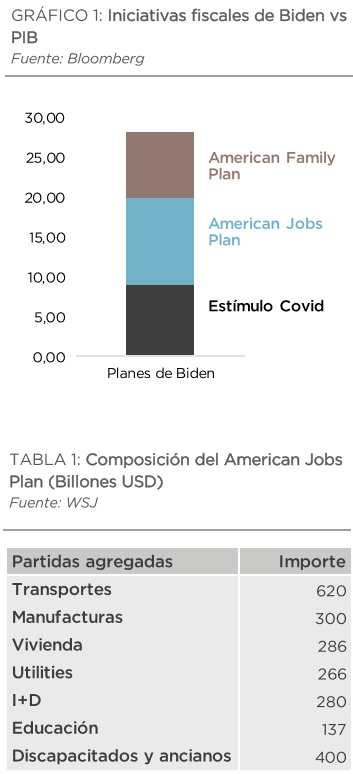 En Estados Unidos, Biden propone un nuevo plan de gasto de dinero público de 2,25 billones de dólares (1.7billones euros) que irá destinado principalmente a infraestructuras, por otro lado, también planea subir la recaudación fiscal en otros 2 billones. La propuesta de gasto de Biden abarcará 8 años. Podemos observar diferencias en la recuperación económica entre Europa y USA debido a los diferentes paquetes de estímulos y plan de infraestructura de Biden y su mayor ritmo de vacunación.