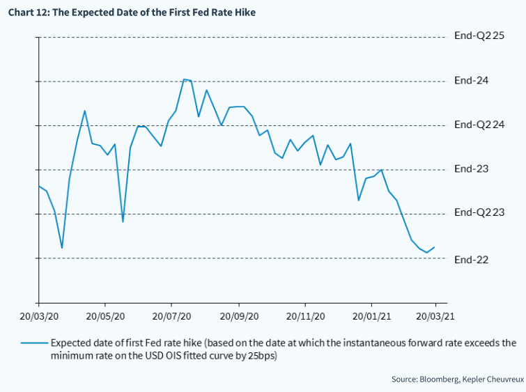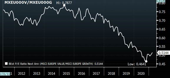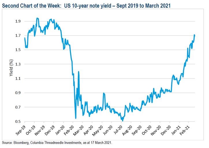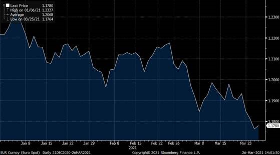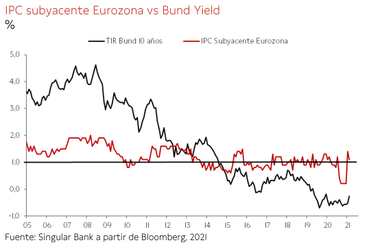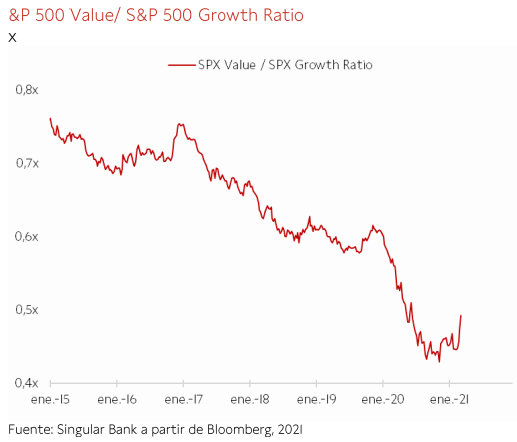El rendimiento del bono americano a 10 años en el primer trimestre ha aumentado en casi 70pb, desde el 0.90% hasta el 1.67% actual. El nivel de la deuda soberana determina el coste de financiación de las compañías por lo que un incremento en el yield afecta a las previsiones de beneficios. La deuda ha tenido su peor trimestre en 1T2021 desde 1980 con marcadas caídas en los precios de los bonos.