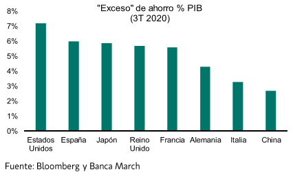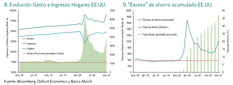 La recuperación es bastante distinta a la que vimos en 2009, es probable que China y Estados Unidos cierren el output gap y estén por encima del pleno empleo en 2022. Estados Unidos debería de alcanzar el 4.5% de paro a finales de año. En 2009, a estas alturas de la recesión, US tenía un desempleo del 9.5%. Los analistas no esperan que la FED y los bancos centrales se lancen a subir tipos a corto-medio plazo. Además, en esta ocasión Estados Unidos no presenta un exceso de gasto como podía presentar en 2009 en términos de compra de vivienda. Esta vez los hogares presentan unos balances más sólidos gracias al exceso de ahorro. Los mercados emergentes serán quienes se lleve la peor parte, la baja tasa de vacunación y el poco margen fiscal dejarán a la región (exChina) alrededor de un 4% por debajo de los niveles de pandemia.