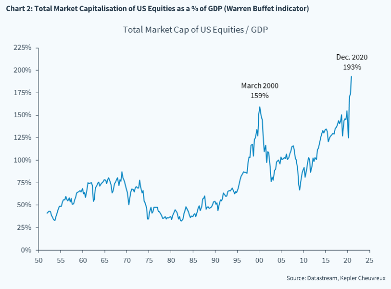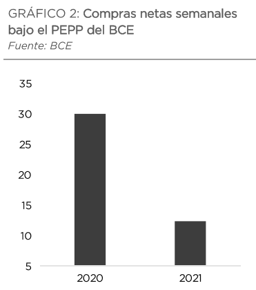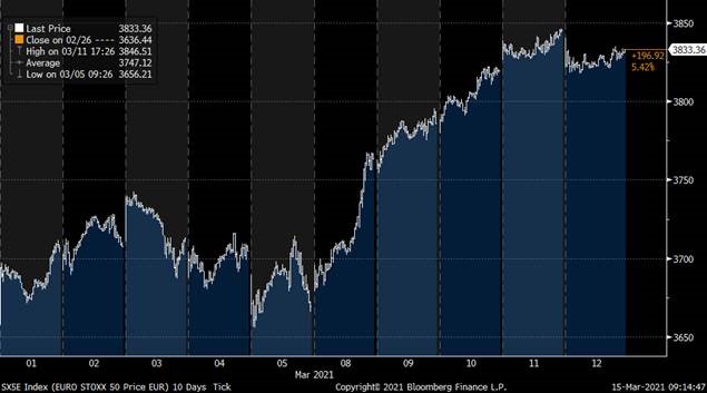 El mercado seguirá centrado en el riesgo de una subida en las rentabilidades de los bonos soberanos americanos desordenada (caídas en precio). El déficit de 3,8 trillones de dólares supondrá una oferta neta de bonos de unos 3 trillones. Habrá que ver como absorbe la curva este incremento de oferta. Los estrategas de JPMorgan esperan una curva más empinada del bono a 2 años en adelante, con el bono a 10 años en el 1.95% a finales de año (está en el 1,67%). Los inversores siguen dudando sobre si la reflación será ordenada o desordenada, pero el ritmo de emisión da un argumento mucho más contundente sobre cómo ven las compañías las condiciones de mercado a futuro. Los mercados han contado con el soporte de los planes de Biden y las yields de los Treasuries han reaccionado bien ante las expectativas de inflación. No obstante, la discusión es si estamos entrando en una nueva fase y si los planes del gobierno puede acabas con este “sugar rush”.