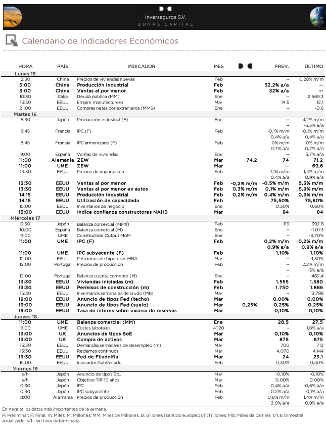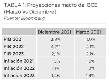 El martes el Fondo Monetario Internacional revisó al alza las previsiones de PIB global (World Economic Outlook) 2021 hasta +6% (+0,5% vs enero, EEUU +1,3%) y +4,4% en 2022 (+0,2% vs enero), aunque reiterando la incertidumbre ante la carrera entre la campaña de vacunación y la aparición de nuevas variantes del Covid más contagiosas. En su opinión, el fuerte estímulo fiscal no se traducirá en repunte sostenido de inflación (persisten fuerzas globales desinflacionistas), a la vez que espera que bancos centrales y gobiernos mantengan controlada la situación.