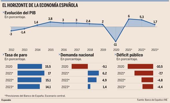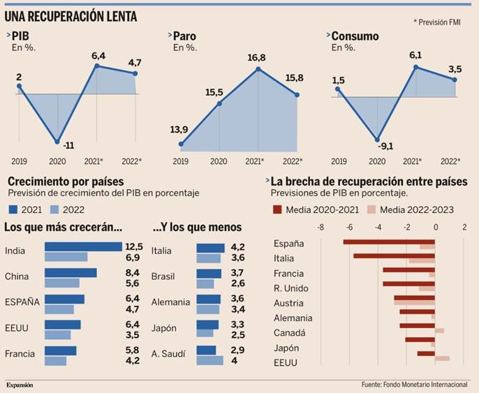 Pero después del agujero que abrió el Covid-19 en la economía en 2020, de poco le servirá a España ser una de las locomotoras del crecimiento en 2021. El PIB se hundió un 11% en 2020, por lo que el rebote estimado para este año no será suficiente regresar a niveles prepandemia ni este año ni el que viene. En cuanto a la evolución del paro, que en 2020 subió al 15,5% y que este año seguirá aumentando hasta el 16,8% según previsiones del FMI, y eso pese al fuerte crecimiento esperado.