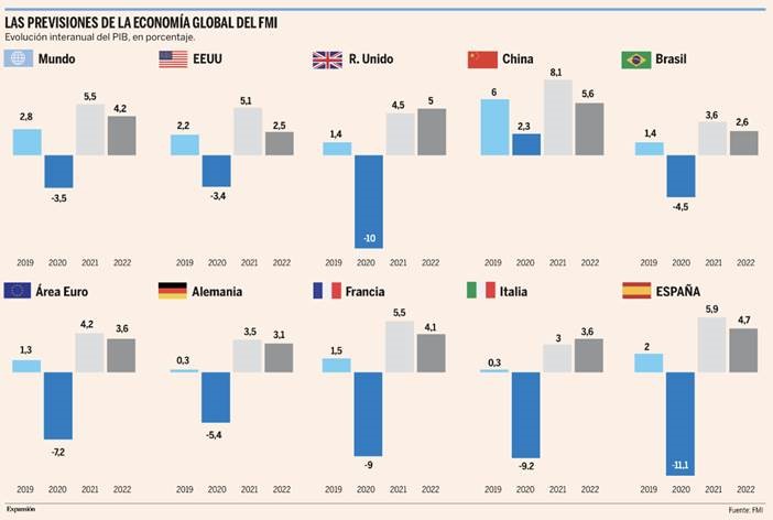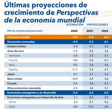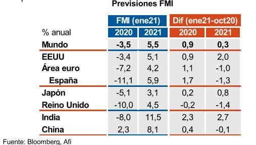 El FMI actualizó el martes sus previsiones de crecimiento 2021, revisando PIB global +0,3% hasta +5,5% (expectativas de vacunas y más estímulo fiscal de Biden), sustentada principalmente en EEUU (+2% hasta +5,1%), pero con revisiones a la baja en Europa (-1% hasta +4,2%. España, de los peor parados +5,9% en 2021 (-1,3% vs estimación en Octubre del 2020, vs Gobierno +9,8%). En positivo, China alcanzó ya en 4T20 su nivel previo a la pandemia, mientras que EEUU lo hará en 2021, muy por delante de la Eurozona que lo hará a finales de 2022.