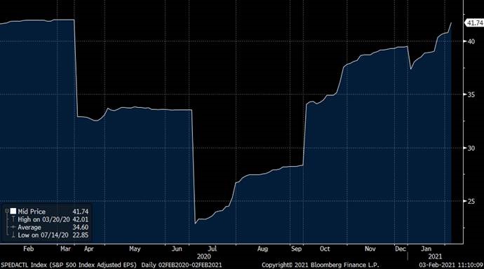 Gráfico del S&P 500 Index Adjusted EPS desde Enero del 2020.