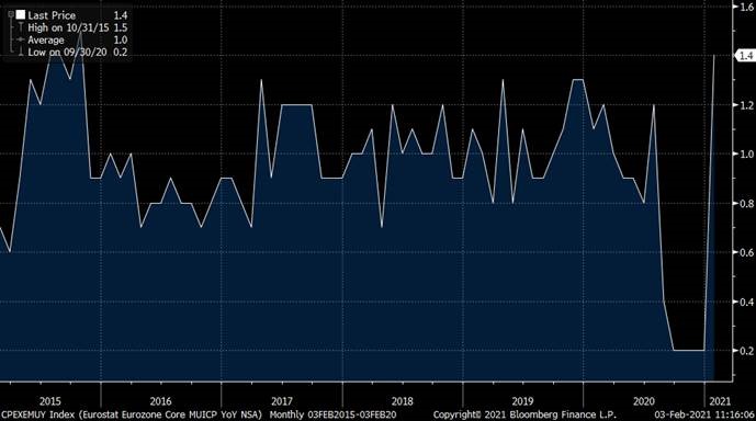 Inflación core Eurozona (1,40% 4T20 interanual) en máximos de los últimos 5 años. La inflación core excluye los precios de la energía, comida, alcohol y tabaco.