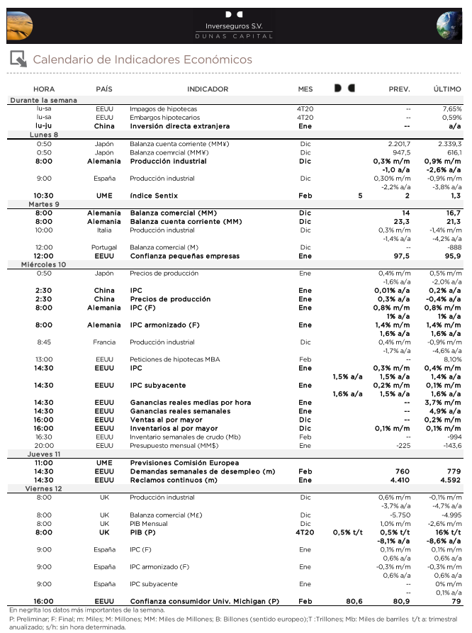 De cara al resto de la semana, la atención macro se centrará en el informe oficial de empleo de enero en Estados Unidos y el PIB 4T20 en la Eurozona.