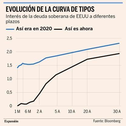 Este indicador, que puede parecer algo técnico, mide la diferencia entre el interés que paga el Tesoro por su deuda a dos años y el que abona por los intereses a 10. Cuanto más elevado es ese diferencial, mayor es la certeza que demuestran los bonistas de que la inflación será más alta en el futuro y de que, por lo tanto, la Fed se verá forzada a subir los tipos de interés para contenerla. Por el contrario, cuando está plana, como en 2020, anticipa estancamiento y tipos estables o más bajos en el futuro. En la actualidad, el interés de la deuda a dos años se sitúa en el 0,1%, mientras que el de los bonos a 10 años ha escalado hasta el 1,159% (Gráfico de abajo).