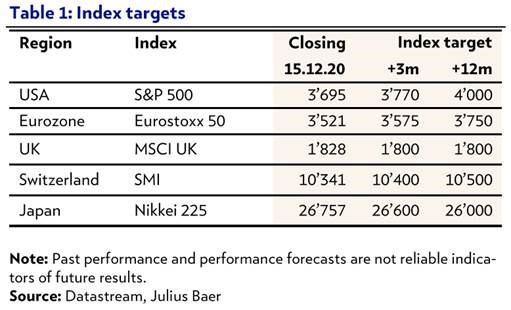 Por su parte, Julius Baer llega a la misma conclusión, aunque por otro factor: la lentitud de la vacunación. “Creemos que las restricciones continuarán en 2021 hasta que un porcentaje mayoritario de la población esté vacunado, lo que aún afectará al gasto de los consumidores y al turismo.