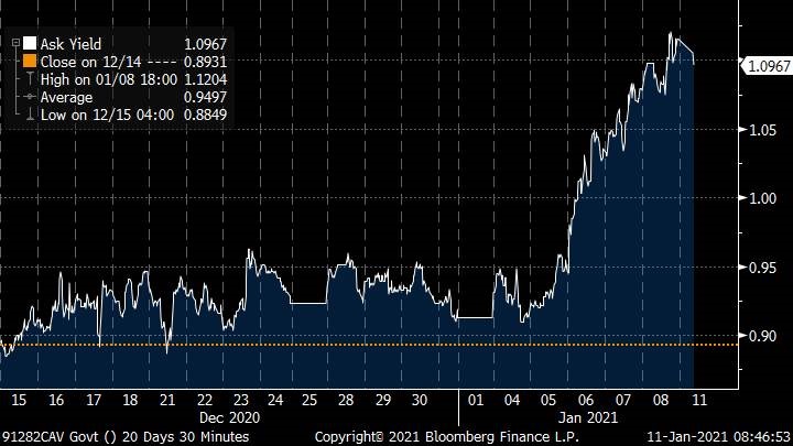 El bono a 10 años americano alcanza sus niveles más altos en 10 meses y cotiza ya al 1.146%. La lentitud del proceso de vacunación y de la recuperación económica han motivado ventas masivas en la curva del tesoro americano que se están traduciendo en que esta tome algo de pendiente en la parte del bono a 10 años particularmente. Un bear-steepeningmuy claro que ocurre de manera sistemática desde el 1 de Enero donde el bono a 10 años cotizaba en el área del 0.91%. Para ponerlo en relativo las referencias Europeas han cedido unos 5-10 puntos básicos de media en lo que llevamos de año con lo cual el movimiento del bono americano es notable con +20bps de incremento en rentabilidad en las últimas sesiones y con una corrección importante overnight que lo aleja de 1.18%.