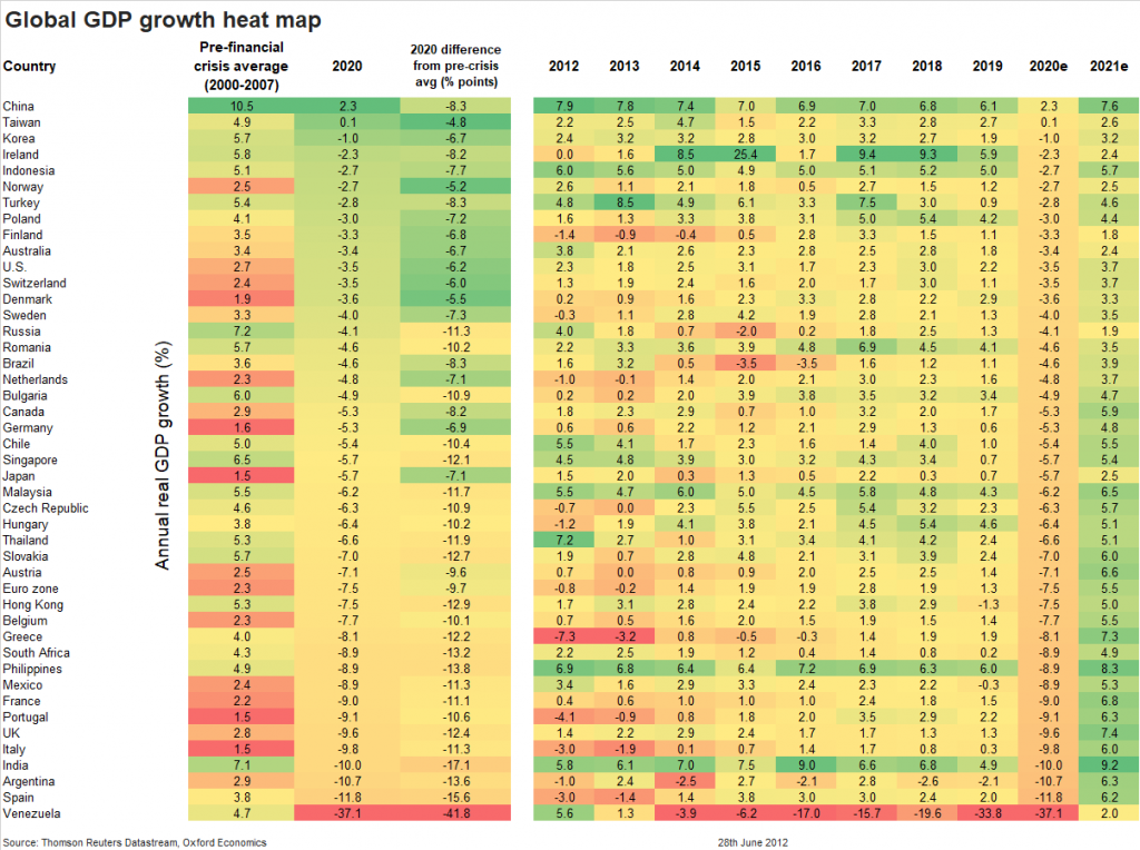 Tanto Bank of America como Julius Baer publicaron sus previsiones de crecimiento, y ambos rebajan sus pronósticos hasta el 4%. Esto es, muy lejos de una recuperación en V, lo que alejaría un año o dos la recuperación completa de la crisis del coronavirus. Bank of America explica que la principal razón de este recorte es la recesión que tendrá lugar en toda Europa entre el cuarto trimestre del año pasado y el arranque de este ejercicio, con la pérdida de un 1,4% y un 0,9% de la actividad económica, respectivamente. “Un mayor cierre, una reapertura más tardía, un menor crecimiento”, resume el banco de inversión.
